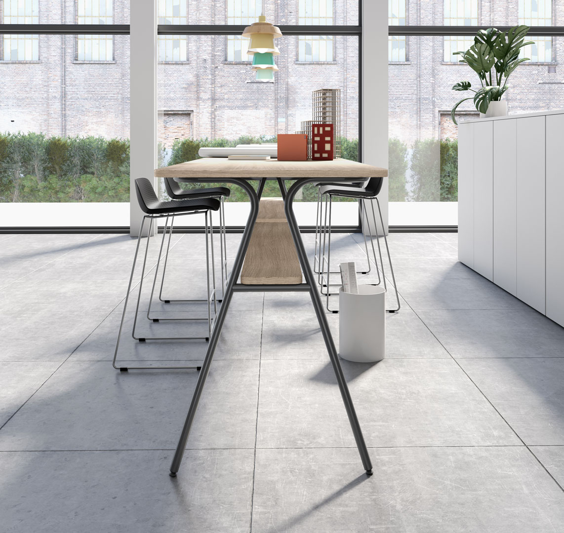 Mesa para reuniones de carácter más informal, ideales para zonas comunes dentro de la empresa, favorecen una comunicación más dinámica entre compañeros de trabajo, también resultan adecuadas para breves reuniones con clientes, o como punto de apoyo para presentación de productos.